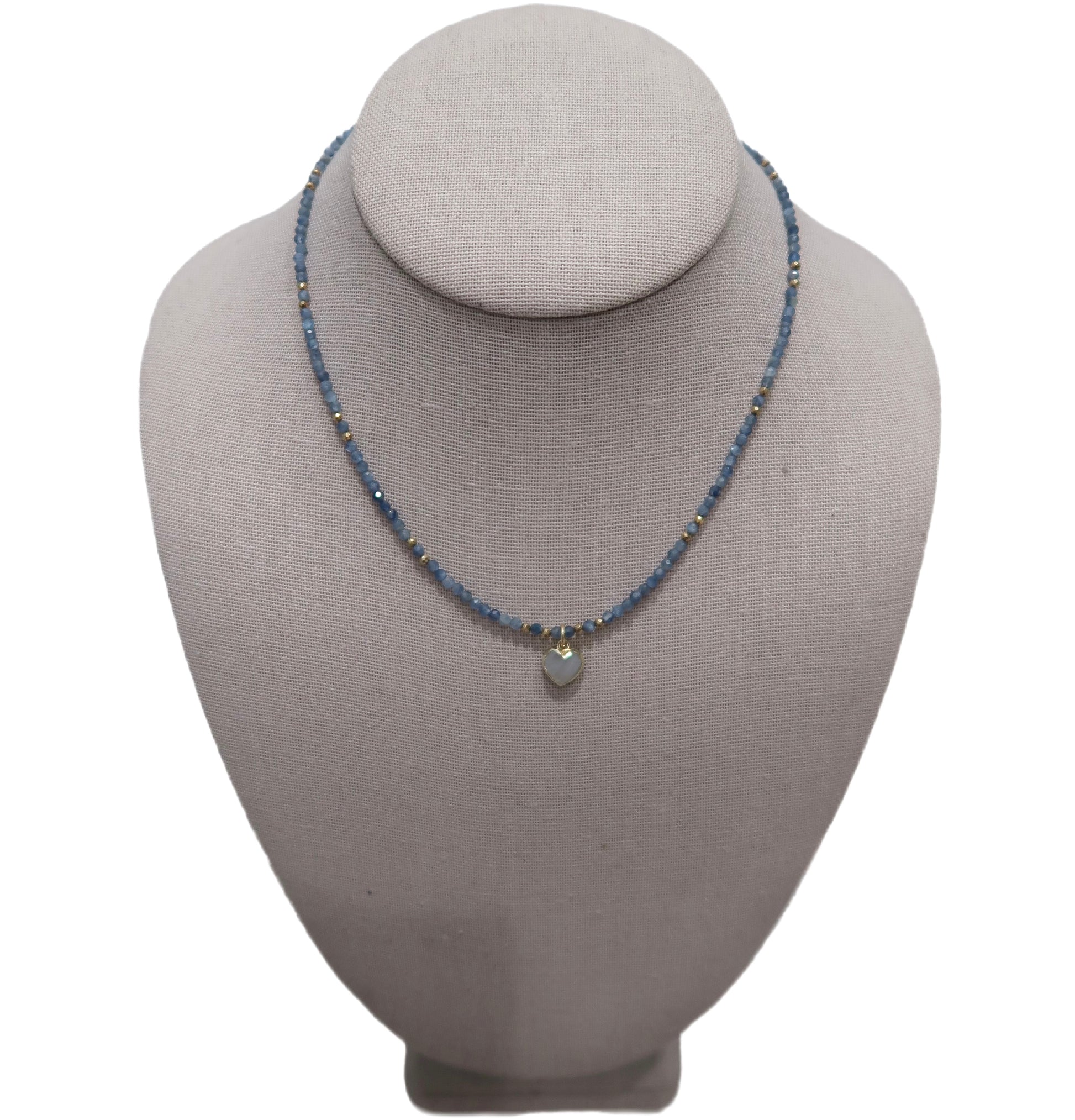 The Arabella Necklace is a harmony of strength, intuition, and divine energy. Featuring Kyanite, a stone of alignment and clear expression, paired with protective Pyrite for confidence and creativity, this piece radiates balance and empowerment. At its center rests a delicate moonstone heart pendant, a symbol of intuition, emotional balance, and new beginnings, beautifully tied to the rhythms of lunar energy. Finished with gold-filled hardware for lasting shine, this piece is made to guide you through cycles of growth with clarity and grace.