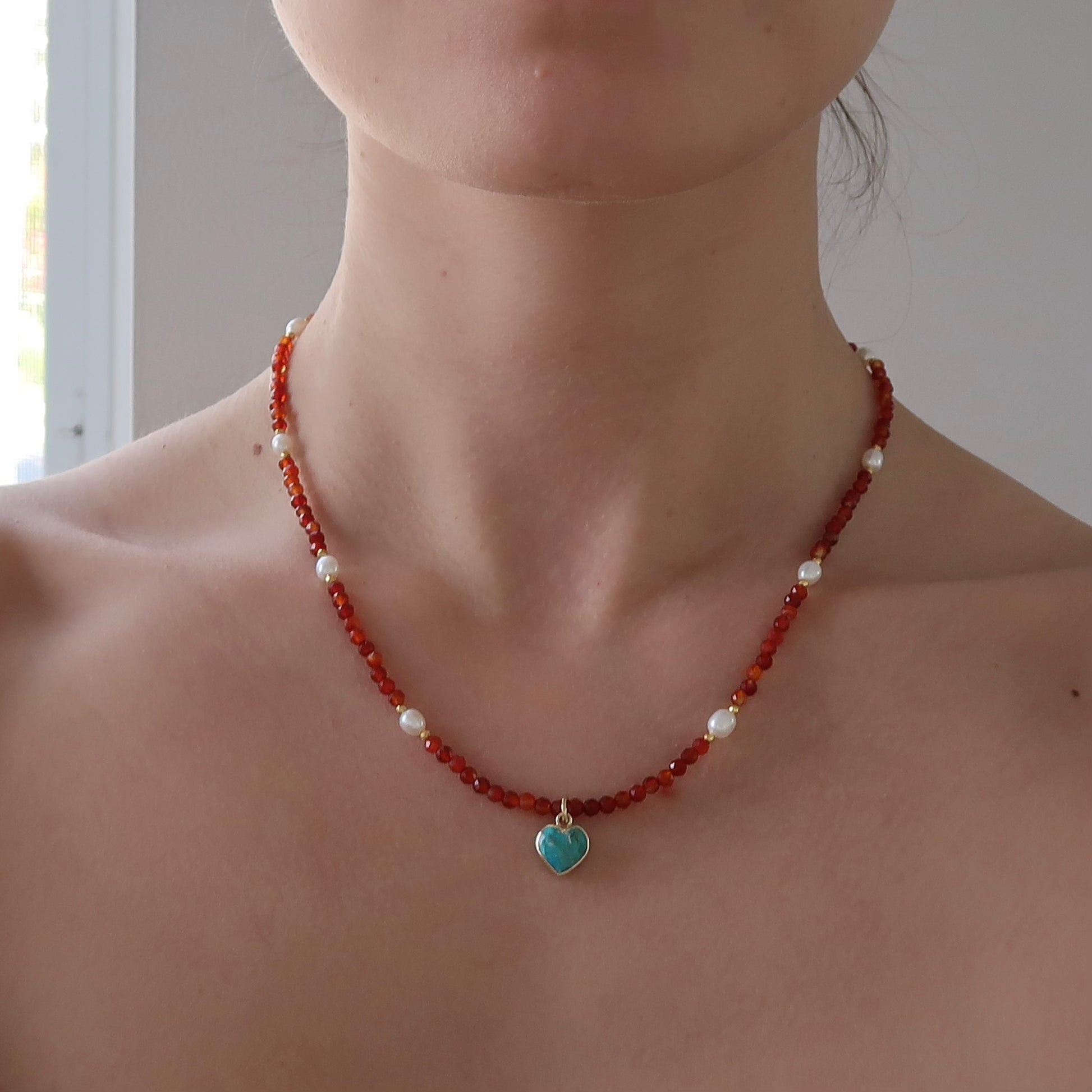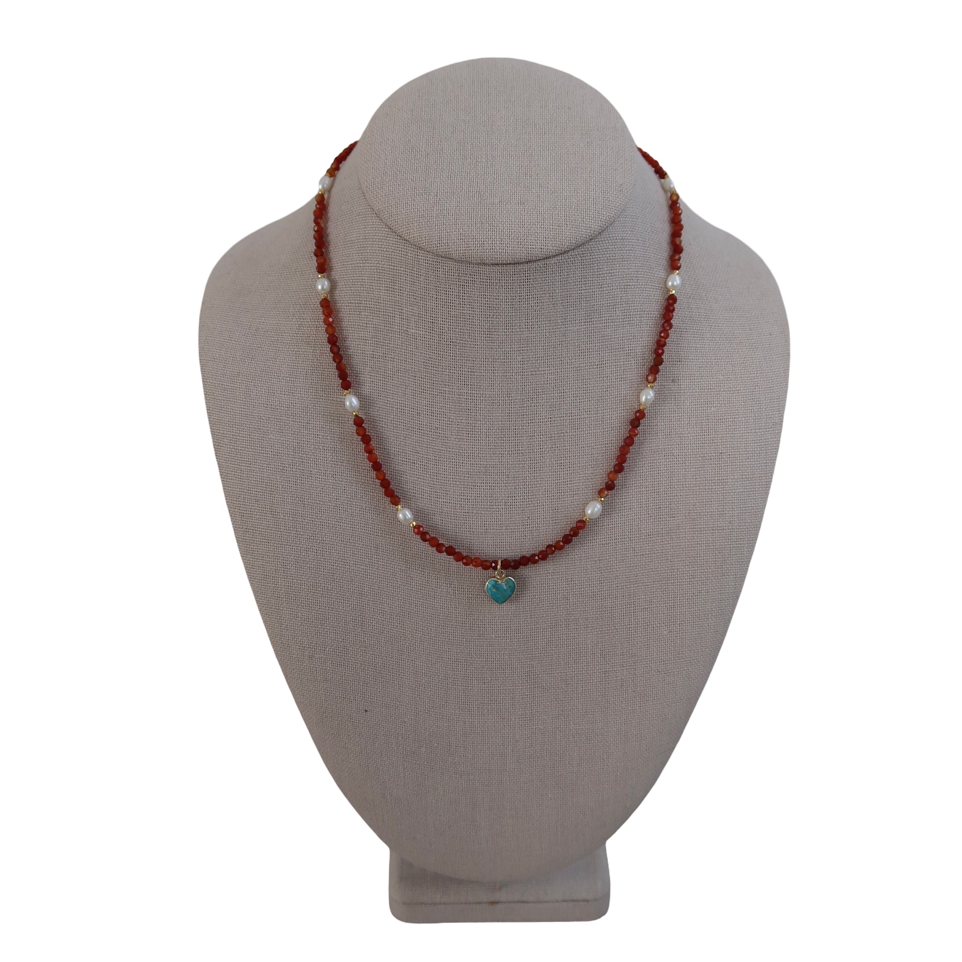 Carnelian and gold-dipped pyrite are paired with dainty freshwater pearls and a faceted turquoise heart pendant, harmonizing autumnal earthy tones with a pop of serene color. On an 18-inch gold-filled chain with extender, Rosalie blends grounded warmth with gentle, ethereal shimmer.